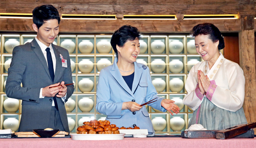 박근혜 대통령은 이날 한식문화관 개관식에 참석해 TV 드라마 ‘태양의 후예’로 국내외에서 높은 인기를 누리고 있는 한국관광 명예 홍보대사인 배우 송중기씨와 함께 한식체험관 등 행사장을 둘러봤다.