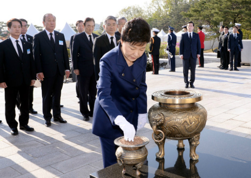 | 박근혜 대통령이 제56주년 4·19기념일인 19일 오전 서울 강북구 수유동 4·19민주묘지를 찾아 4월 학생혁명 기념탑 앞에서 분향하고 있다. 청와대사진기자단 |
