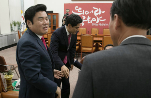 | 원유철 새누리당 원내대표가 19일 국회에서 '새누리당혁신모임' 소속 이학재, 김영우, 하태경, 오신환 의원을 만나 인사하고 있다. 남정탁기자 |