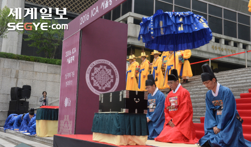 26일 서울 종로구 세종문화회관 앞에서 열린 '2016 ICA(세계기록관리협의회) 서울총회' D-100일 기념행사'에서 홍윤식 행정자치부 장관을 비롯한 참석자들이 조선시대 실록 봉안의식을 재현하고 있다.