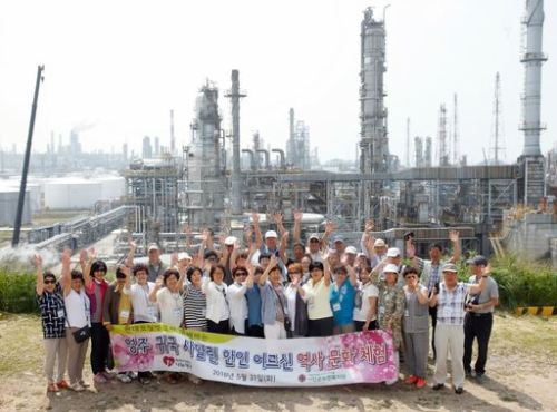 영주 귀국 후 충남 서천군에 정착한 사할린 동포들이 지난달 31일 현대오일뱅크가 마련한 역사문화 체험 및 현대오일뱅크 대산 공장 견학을 마친 후 기념촬영을 하고 있다.