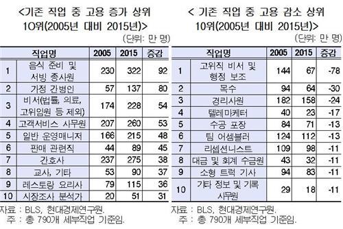 현대경제연구원이 2일 발표한 '미국의 직업별 고용 구조와 시사점' 보고서에 따르면 미국의 전체 일자리는 2005년부터 2015년까지 10년간 760만 명 증가했다.