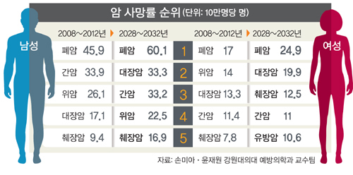 손미아·윤재원 강원대의대 예방의학과 교수팀은 통계청의 2008∼2012년 암 사망인구 데이터를 토대로 2028∼2032년의 암 환자 통계를 추정한 결과 이같이 나타났다고 20일 밝혔다. 2008∼2012년 우리나라의 인구 10만명당 암 사망자 수(조사망률)는 남성의 경우 폐암(45.9명), 간암(33.9명), 위암(26.1명), 대장암(17.1명), 췌장암(9.4명) 순으로 나타났다. 여성 역시 폐암 사망률이 17명으로 가장 높았고, 위암(14명), 대장암(13.3명), 간암(11.4명), 췌장암(7.8명) 순이었다.
