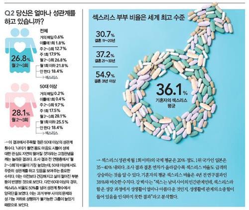 조사결과 기혼자 743명 가운데 성관계가 월 1회 이하이거나 없다고 응답한 비율을 더한 '섹스리스'는 36.1%였다.