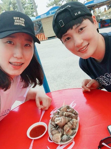 공개된 사진 속에는 미소를 지어 카메라를 응시하고 있는 박정아, 김희진의 모습이 담겨있다. 테이블 위에는 소라가 접시에 담겨 있어 두 사람은 즐거운 한 때를 보내고 있다.