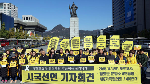세월호 유가족들로 구성된 4‧16가족협의회와 4‧16연대는 지난 1일 서울 광화문광장에서 시국선언 기자회견을 열고 “민주공화국 헌정 파괴, 국정농단의 주범 박근혜는 당장 물러나라”고 말했다.