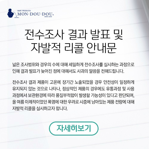 몽드드 측은 “전수조사 결과 제품이 고온에 장기간 노출되었을 경우 안전성이 일정하게 유지되지 않는 것으로 나타나 정상적인 제품의 경우에도 유통과정 및 사용과정에서 보관환경에 따라 품질부적합이 발생할 가능성이 있다고 판단된다. 올 여름 이례적인 폭염이 있었던 만큼 시중에 남아있는 제품 전량에 대해 자발적 리콜을 실시한다”고 밝혔다.