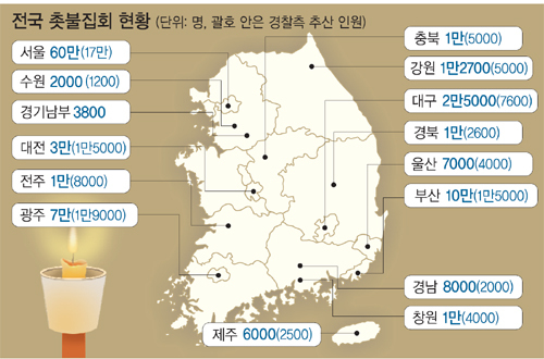 이날 주최 측과 경찰이 추산한 광화문광장 일대의 촛불집회 참가자는 각각 60만명, 17만명이다. 주최 측은 통상 해당 시간대에 현장을 찾은 총 인원(연인원)을 합산해 추산하는 반면 경찰은 참가인원이 가장 많은 시점을 기준으로 ‘페르미 계산법’을 적용한다.