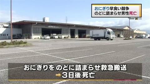 22일 일본 NHK 등 현지 언론 보도에 따르면 시가현 히코네시에서 열린 주먹밥 빨리 먹기 대회에 참가한 이 지역 거주 28세 남성이 주먹밥을 먹다 목에 걸려 병원으로 옮겨졌으나 3일 후 사망했다.