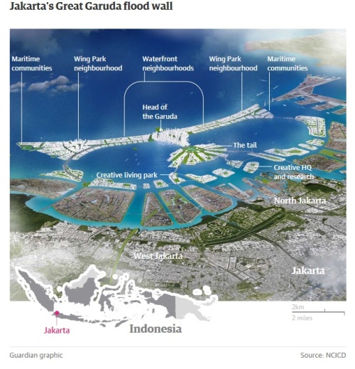 인니 정부도 2050년 정도가 되면 자카르타 전체 면적의 25%가 바다에 잠길 것이라며 가루다 프로젝트를 시작했다. 가루다의 형상으로 거대 방조제를 쌓음으로써 해수 유입을 차단하고 가둔 물을 정화해 강이나 운하로 흘려보내 지반 침강을 막겠다는 계획이다. 가디언은 하지만 초기 사업 이후 민간자본을 끌어들이겠다는 정부의 계획이 제때 성사될 수 있을지 의문이라고 지적했다. 부동산업자들이 규제 완화를 위해 공무원들에게 뇌물을 줬다가 올 초 적발되면서 사업 동력이 끊긴 것도 문제다. 여기다 엄청난 길이의 제방으로 수질오염 등이 가속화할 수 있다는 분석과 환경단체 반발 등 사업이 본궤도에 오르기 위해 넘어야 할 언덕이 너무 많다는 분석이다.