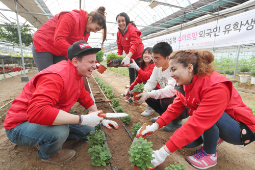 | ‘KT 드림스쿨 글로벌 멘토링’ 프로그램에 소속된 외국인 유학생들이 경기도 남양주에 있는 장애인 맞춤형 스마트팜을 찾아 농장의 일손을 돕고 있다. KT 제공 |