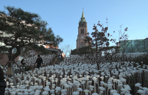 한국천주교회의 중심이며 민주화의 상징인 주교좌명동대성당 들머리. 이곳에서 사람이 사람답게 살 수 있는 세상을 꿈꿨던 고(故) 김수환 추기경을 기억하자는 취지로 4000송이의 ‘LED 장미 정원(The Light Rose Garden)’을 조성했다. 이 장미 정원은 12월 한 달간 ‘희망의 빛’을 밝힌다. 김현태 기자 jknewskr@segye.com Copyright ⓒ 세계일보. 무단 전재 및 재배포 금지