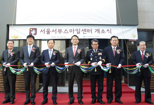 | 이창재 법무부 장관 직무대행(가운데)이 28일 서울 마포구 성산로 서울서부스마일센터 개소식에서 주요 참석자들과 함께 테이프커팅을 하고 있다. 법무부 제공 |