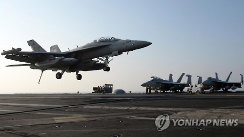 | 미국 항공모함 로널드레이건호 갑판에 착륙하는 F-18 호넷 전투기 [연합뉴스 자료사진] |