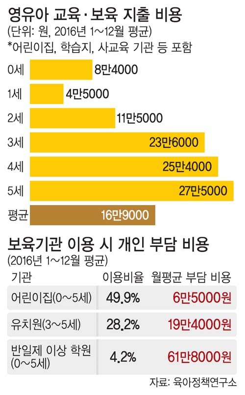 지난해 각 가정에서 영유아의 교육과 보육에 투입한 월평균 비용은 16만9000원으로 아동 나이가 늘어날수록 비용도 증가했다. 연령별로는 0세 8만4000원, 1세 4만5000원, 2세 11만5000원, 3세 23만6000원, 4세 25만4000원, 5세 27만5000원이었다. 정부에서 지원하는 보육 기관뿐만 아니라 학원·학습지 등 사교육 서비스 이용 금액을 포함한 수치다.