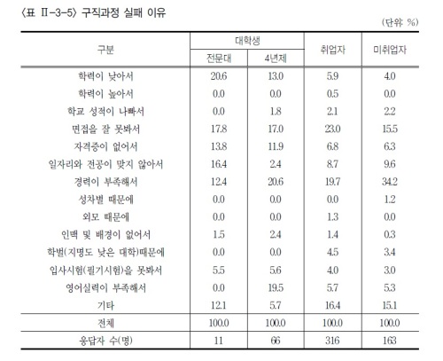 취업에 실패한 이유로는 전문대생의 경우 ‘학력이 낮아서’(20.6%), 4년제 대학생의 경우 ‘경험이 부족해서’(20.6%), ‘영어실력이 부족해서’(19.5%)라고 답했다. 반면 취업자는 ‘면접을 잘 못 봐서’(23.0%)를, 미취업자(취준생)는 ‘경력이 부족해서’(34.2%)를 구직에 실패한 최대 이유로 꼽았다.