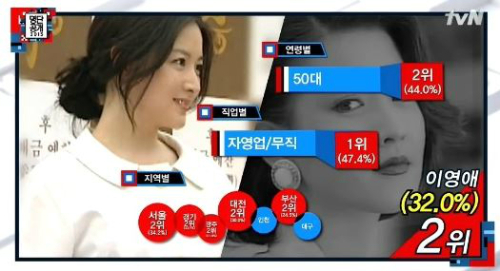 당시 이영애는 40대와 50대의 전폭적 지지 속 23.0%의 득표율을 기록하며 '예쁜 얼굴' 2위에 올랐다.