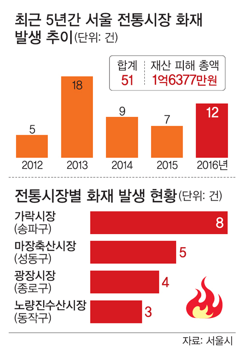 서울시는 2012년부터 2016년까지 전통시장에서 51건의 화재가 발생했다고 6일 밝혔다. 연도별로는 2012년 5건에서 2013년 18건으로 급증했다가 2014년 9건, 2015년 7건으로 줄었으나 지난해 다시 12건으로 늘었다.