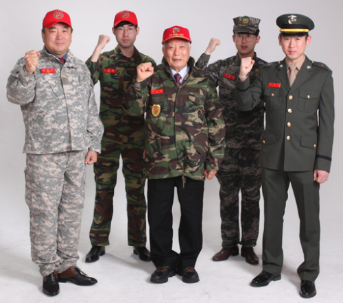 | 할아버지부터 손자까지 3대가 해병대 출신인 해병대 제1사단 32대대 정보장교 정철희(25·오른쪽) 중위 일가가 해병대 상징인 빨간 명찰을 달고 포즈를 취하고 있다. 왼쪽부터 아버지 정세호(54·해병 466기·1사단 근무), 형 한석(27·해병 1087기·아이티 재건지원단 근무), 할아버지 정수현(77·해병부사관 4기·1사단 등 근무), 동생 석희(22·해병 1188기·계룡대 근무지원단 근무)씨와 정 중위. 해병대 제공 |