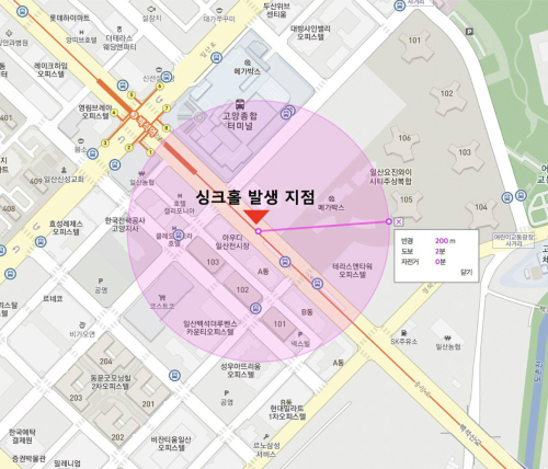 또 싱크홀이 발생한 도로 바로 앞에는 그 원인으로 추정되는 터파기 공사현장이 있었고, 도로를 둘러싸고 오피스텔 대단지가 밀집해 있었다.