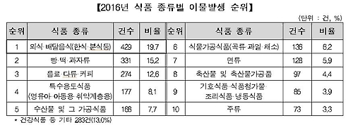 한국소비자원은 지난해 소비자위해감시시스템에 접수된 2천181건의 식품 이물 관련 위해정보 중 외식·배달음식이 429건(19.7%)으로 가장 많았다고 13일 밝혔다.
