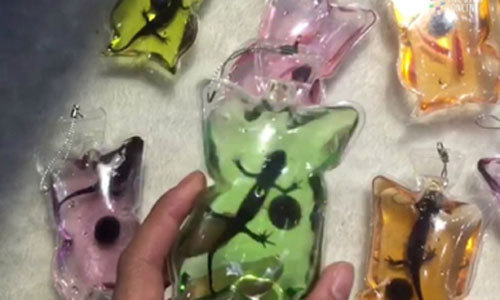 중국 상하이스트는 샤먼시의 한 시장에서 팔리는 열쇠고리에 도롱뇽과 새끼 거북 등이 산 채로 들어 있다고 말레이시아 더 스타 TV를 인용해 지난 5일 보도했다. 이들 열쇠고리는 관광객들을 위한 기념품이며, 1개당 판매가는 15위안(약 2500원)~20위안(약 3400원)으로 알려졌다.