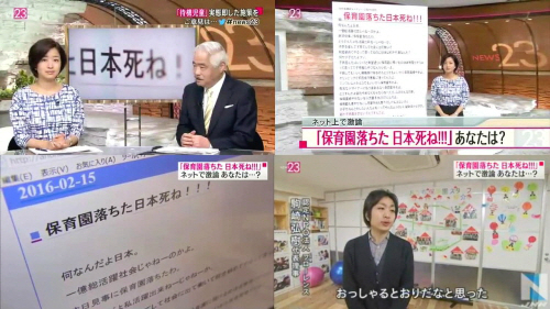 | 일본에서 보육원 입소 여부는 해마다 2월 말~3월 초 신청자 가정에 통보된다. 보육원의 부족 문제를 다룬 현지 방송 프로그램을 캡처했다. 이 방송은 "여성의 사회 진출에 걸림돌이 된다"고 지적했다. 사진=JNN 방송화면 캡처 |