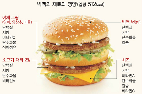 ‘빅맥’ 1개를 먹으면 하루 권장 섭취량 기준으로 12%가량의 탄수화물과 47%가량의 단백질, 28%가량의 칼슘을 섭취할 수 있는 셈이다. 진우식 맥도날드 홍보팀장은 “(맥도날드 햄버거는) 100% 호주·뉴질랜드산 순소고기 패티를 매장에서 소금과 후추만 뿌려 조리하고, 매일 구운 신선한 빵과 엄선된 농장에서 공급받는 야채만을 사용한다”며 “맥도날드의 글로벌 노하우가 접목된 ‘메이드포유(Made For You)’라는 시스템을 통해 고객의 주문이 들어오는 즉시 햄버거를 만들어 제공한다”고 강조했다. 고객에게 가장 따뜻하고 신선한 제품만을 전달하고자 노력하는 맥도날드의 경영철학이 담겨 있다.