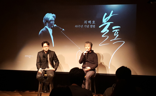 | 40주년 기념 앨범 ‘불혹’을 발표한 ‘낭만가객’ 최백호가 9일 서울 마포 마포문화원 뮤지스땅스에서 음악 감상회를 하고 있다. 인넥스트트렌드 제공 |