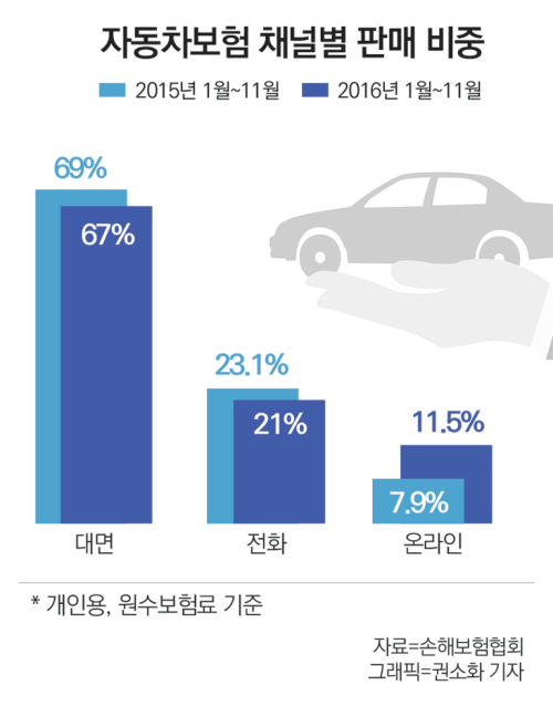 21일 손해보험협회에 따르면 지난해(1월~11월) 온라인 개인용 자동차보험 판매 비중(원수보험료 기준)은 11.5%로 전년 동기(7.9%)보다 3.6%포인트 늘어났다.