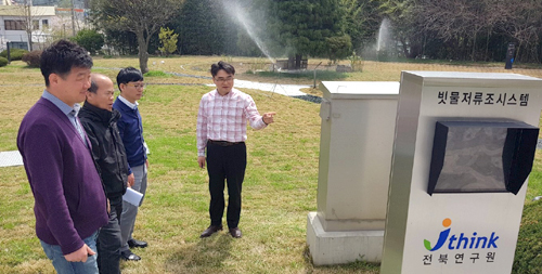 | 12일 전주시 맑은물사업소 직원들이 전북연구원을 찾아 관계자로부터 청사 앞 정원에 구축된 빗물이용시설 운영 상황에 대해 설명을 듣고 있다. 김동욱 기자 |