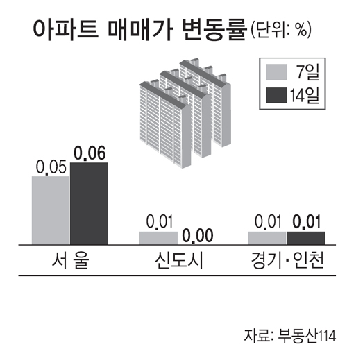 16일 부동산114에 따르면 4월 둘째 주(14일 기준), 서울 아파트 매매가격은 일주일 전에 비해 0.06%의 변동률을 나타내며 13주 연속 상승했다. 사업 진행속도가 빠른 재건축 단지나 도심의 업무지구 주변 아파트를 찾는 매수세가 꾸준히 유입되면서 서울 아파트값이 상승 흐름을 이어가고 있다는 분석이다. 부동산114 관계자는 “아직 재건축 사업이 초기 단계인 단지에서는 대출규제강화와 새정부의 부동산정책 불확실성 등이 맞물려 일부 가격이 약세를 보일 것으로 예상하기도 했지만 매수자들의 관망세가 짙고 매도자 역시 매매가 급하지 않은 이상 서둘러 팔지 않는 분위기로 보합세가 유지 중”이라고 설명했다. 신도시(0.00%)와 경기·인천(0.01%) 역시 관망세가 짙어 가격 변동성이 작다.