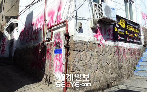 ‘벽화, 왜?’ 마을 주민들이 붉은 페인트로 덧칠했다. 주민들은 수원시에서 주택 10채를 선정해 문화시설로 지정·보존하겠다고 발표 후 분노했다. 사전 논의도 없이 일방적인 통보를 받았다는 것이다. 문제는 문화시설로 지정되면 재건축 등 개발 행위가 제한받아 재산권 행사에 침해를 받는다는 것이다. 항의 차원에서 벽화를 훼손한 것. 훼손된 벽화 중에서는 유명 작가의 작품도 포함됐다.