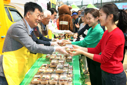 | 25일 서울 성동구 살곶이 체육공원에서 열린 `봄맞이 한우 숯불구이 축제`에서 민경천 한우자조금관리위원장(왼쪽)과 참석자들이 시민들에게 한우스테이크를 나눠주고 있다 |