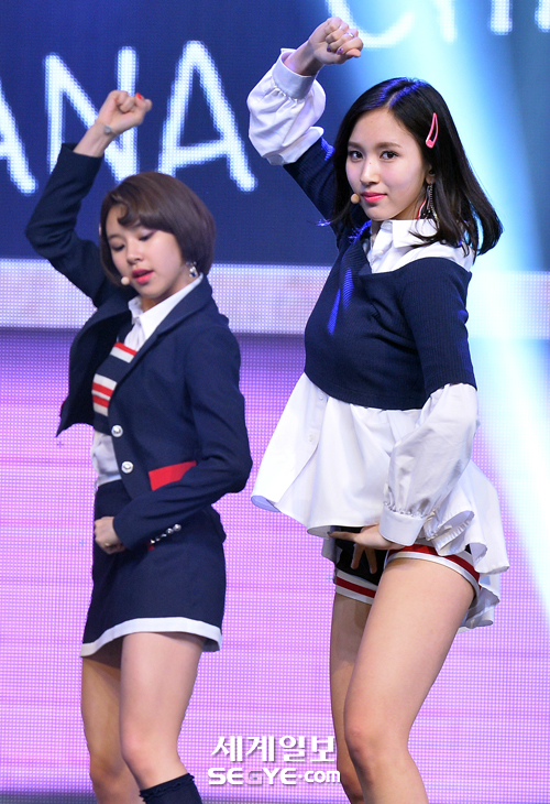 걸그룹 트와이스 채영(사진 왼쪽), 미나가 15일 오후 서울 한남동 블루스퀘어에서 열린 새 미니 앨범 '시그널'의 발매 기념 쇼케이스에서 열띤 공연을 펼치고 있다.