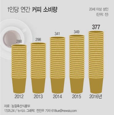 1인당 연간 커피소비량은 ▲2012년 288잔 ▲2013년 298잔 ▲2014년 341잔 ▲2015년 349잔으로 꾸준히 늘어 나 지난해에는 377잔에 달했다.