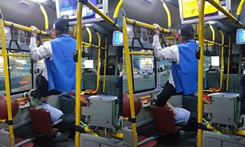 사진만을 놓고 보면 할아버지가 버스 손잡이를 잡고 그 반동을 이용해 노약자석에 앉은 승객을 향해 발길질 했다.