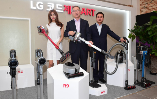 송대현 LG전자 H&A 사업본부장(가운데)과 최상규 LG전자 한국영업본부장이 12일 서울 여의도 LG트윈타워 서관에서 무선청소기 '코드제로 ART 시리즈'를 선보이고 있다. '코드제로 ART 시리즈'는 핸드스틱 청소기 '코드제로 A9', 로봇청소기 '코드제로 R9', 무선 진공청소기 '코드제로 T9'으로 구성된다.