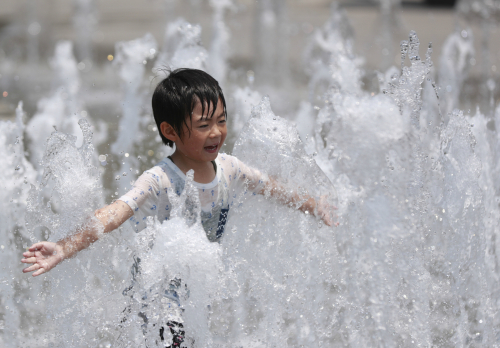 서울, 광주 등 전국 곳곳에 16일 폭염주의보가 내려졌다. 분수대에서 어린이가 물놀이를 하거나 내리쬐는 땡볕을 피해 그늘을 찾았다.