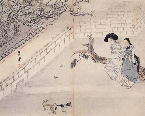 | 신윤복의 ‘이부탐춘’(嫠婦耽春). 이부(嫠婦)는 과부(寡婦)를 뜻하고 탐(耽)은 즐긴다는 뜻으로 여성의 탐욕 심리를 춘화적으로 그린 작품. 간송미술관 제공 |