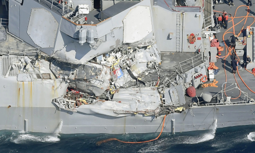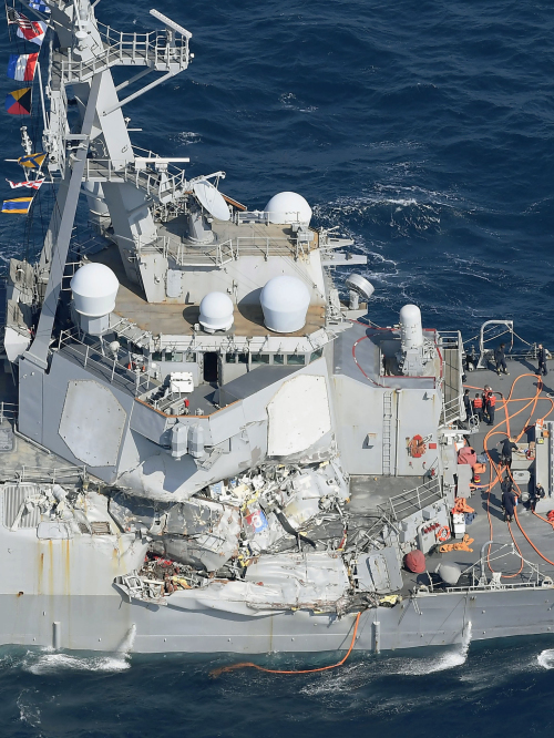 앞서 요코스카(橫須賀)항을 거점으로 하는 미국 해군 제7함대 소속 이지스 구축함 피츠제럴드(8315t 길이 154m)는 전날 오전 1시께 시즈오카(?岡)현 이로자키(石廊崎) 남동쪽 20km 해상에서 필리핀 선적 컨테이너선 ACX 크리스털(2만9060t 222.6m)과 충돌, 승조원 7명이 실종되고 3명이 부상했다.