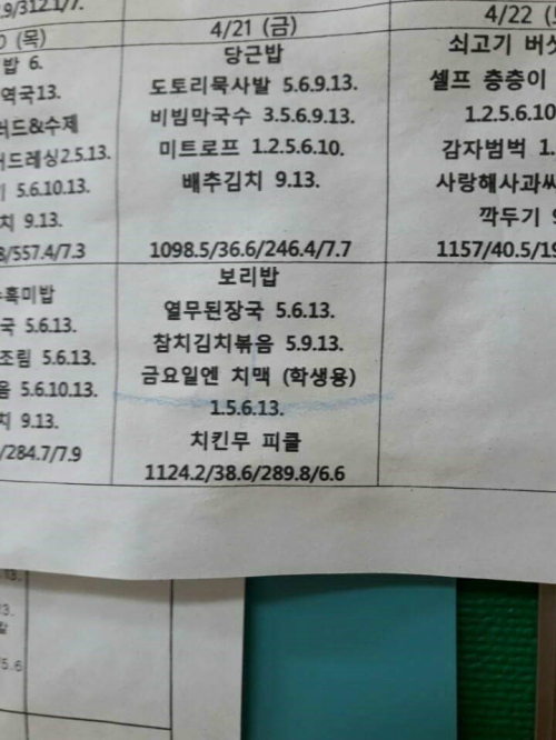 해당 학교에서는 지난 4월21일 석식 표에 ‘금요일엔 치맥(학생용)’이라는 메뉴를 적어놨다. 당시 표를 확인한 학생들은 “진짜 불금에 치킨 먹는 거냐” “맥주가 아니면 ‘맥’은 무엇을 뜻하지” 등의 기대감을 보였다.