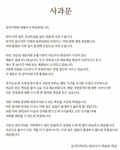 | 박용준 삼진어묵 대표의 사과문. 사진=삼진어묵 홈페이지 캡쳐 |