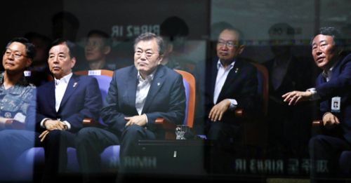 | 문재인 대통령이 23일 충남 태안에 위치한 국방과학연구소(ADD) 종합시험장을 방문해 사거리 800㎞의 현무-2C 탄도미사일 발사시험을 참관하고 있다. 청와대 제공 |