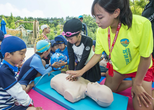 | 캐리비안 베이의 안전요원들이 수상 안전문화를 전파하기 위해 어린이들에게 심폐소생술(CPR) 교육을 진행하고 있다. |