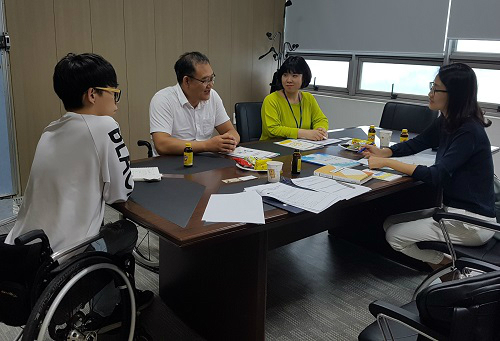 | 부산지역 휠체어 장애인들의 권익을 옹호하는 공익인권단체인 사하두바퀴장애인자립생활센터 관계자들이 회의를 하고 있다. 이 센터는 올 하반기 재단법인 동천에서 재정 및 법률 지원을 받게 됐다. 재단법인 동천 제공 |