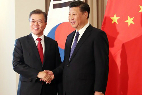 긴장감이 가장 높았던 회담은 역시 사드(THAAD·고고도미사일방어체계) 배치 문제로 갈등을 빚어왔던 중국 시진핑(習近平) 주석과의 대좌. 회담 시간이 총 40분으로 예정된 상황에서 시 주석은 굳은 표정으로 무려 15분 동안 중국 측 입장을 죽 늘어놨다. 비로소 발언 차례가 오자 문 대통령은 애초 준비된 바 없던 역사 이야기를 꺼내 수행원을 긴장시켰다. “중국 대륙과 한반도가 사이가 좋을 때 양측이 모두 상생 발전했다”며 통일신라와 당, 고려와 송, 세종 초기 조선과 명을 거론한 것이다. 역사 애호가인 문 대통령과 마찬가지로 역사에 관심이 깊다는 시 주석이 귀 기울여 들으면서 팽팽했던 회담장 긴장이 풀렸다는 게 배석자들의 설명이다. 한 관계자는 “시 주석이 처음부터 회담을 주도해야겠다는 의지가 강하게 느껴졌지만 주도권이 일단 문 대통령에게 완전히 넘어가자 그 흐름을 그대로 받아들였다”며 “그러다 회의 막판에 다시 해야 할 얘기는 해야겠다고 생각했는지 적어온 걸 마저 죽 읽었다”고 전했다.