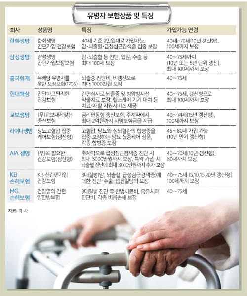 현대해상은 업계 최초로 뇌졸중을 보장하고 건강 회복 시 보험료를 낮춰 주는 간편심사 보험 ‘간단하고편리한건강보험’을 판매 중이다. 보험금 대신 재활지원 프로그램을 제공하는 보험금 지급방식이 특징이다. 언어치료, 심리치료 등의 방문 재활지원은 물론 재활 훈련용 헬스케어 기기도 대여해주고 이송차량도 제공한다. 후유증이 남고 재발률이 높은 뇌졸중의 치료 및 재활 프로그램도 강화했다. 평소 당뇨를 앓았다면 라이나생명의 당뇨고혈압집중케어보험(갱신형)이 맞춤 상품이다. 이 상품은 고혈압, 당뇨와 심·뇌혈관의 합병증을 집중 보장하는 상품으로 특약 가입으로 말기신부전증, 질병실명, 족부절단 등 심각한 합병증에 대한 보장 혜택까지 제공하고 있다. 또 유병자 상품 최초로 백내장 수술 보장(50만원)도 추가했다.