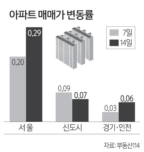 16일 부동산114에 따르면 지난 14일 기준 서울 아파트값은 0.29% 올랐다. 전주 상승 폭은 0.20%였다. 재건축 아파트값은 0.44% 올랐다. 그간 하락세였던 강동구 재건축(0.52%)이 강세로 전환하며 지난주(0.28%)보다 오름폭이 확대됐다. 일반 아파트(0.26%)도 지난주(0.19%)보다 더 많이 올랐다. 구별로는 성동(0.64%) 송파(0.55%) 금천(0.46%) 동작(0.46%) 노원(0.43%) 강동(0.37%) 강북구(0.35%) 순으로 상승 폭이 컸다.