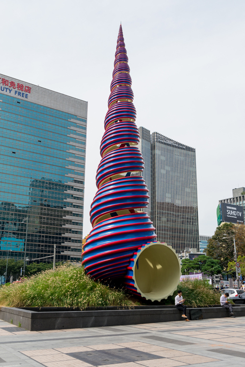 서울시는 스프링의 재도색 작업을 3개월 만에 완료했다고 17일 밝혔다. 스프링은 미국의 세계적 팝아트 작가인 클래스 올덴버그와 코샤 반 브르군 부부의 작품으로, 2006년부터 청계광장에서 시민들을 맞았다. 높이는 20m이며, 하늘로 솟은 삼각뿔 모양을 빗대 시민들에게는 ‘소라탑’이라고도 불린다.